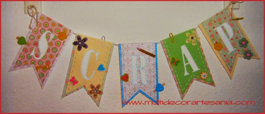 Llevaba tiempo queriendo hacer unos banderines con la palabra SCRAP que decoraran la parte de abajo de una estantería, pensé que darían color a la pared y además no habría duda de la actividad que se realiza en este lugar de mi casa.