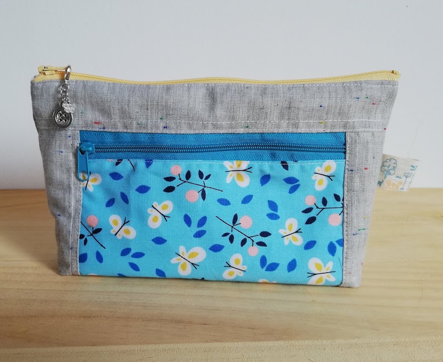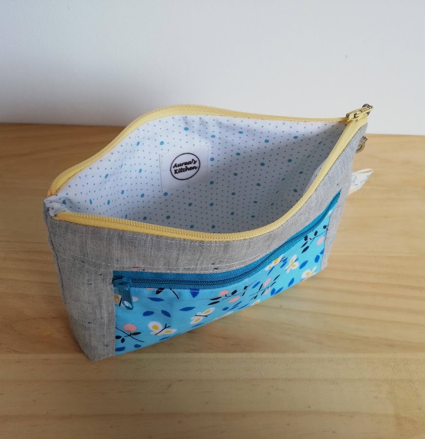 La cremallera principal en amarillo y la pequeña en azul. Me gusta mucho combinar las cremalleras.