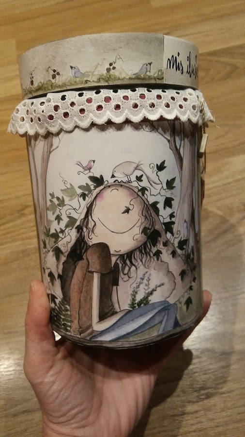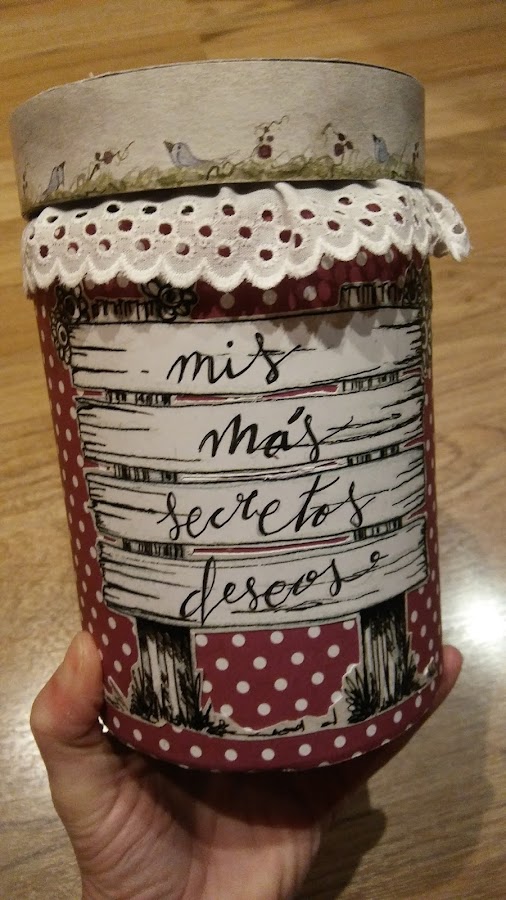 lo he decorado con una puntilla para disimular el final del tarro donde se une con la tapa, pues al tener la forma redondeada la parte de arriba se iba a ver feilla pues se veía un poquito el cristal, además así le da un aire romántico tipo botecito de legumbres de los de las yayas;