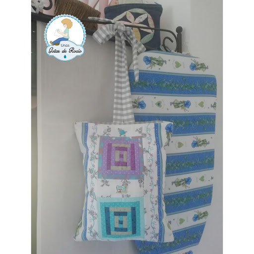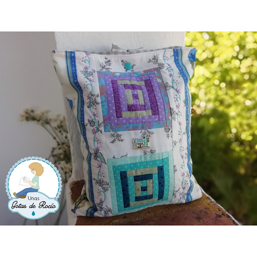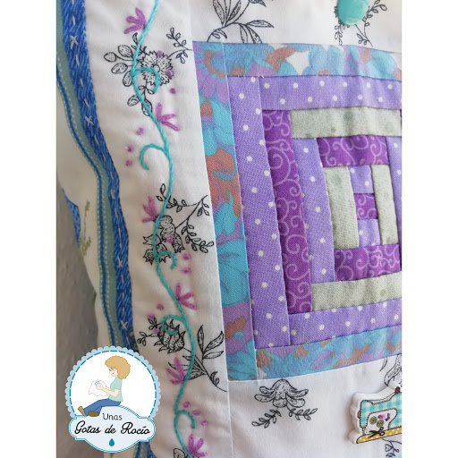 Lleva un par de log cabin que me he entretenido en coser a mano, además de los bordados de los laterales. He usado telas en tonos fríos y la blanca de fondo es un trozo que me sobró de las cortinas de mi cuarto de costura.