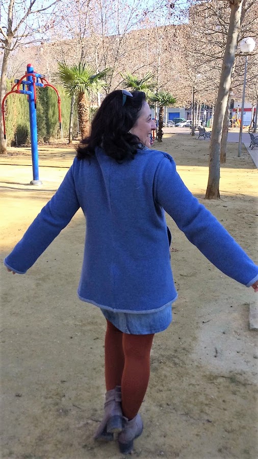 Yo lo he realizado en un tejido de punto de lana de doble cara, con lo cual lo que hice, fue hacer las costuras francesas y así incluso podría hacerse reversible, y no le puse la tela de las vistas en el cuello, porque ya tenia dos tonos distintos.
