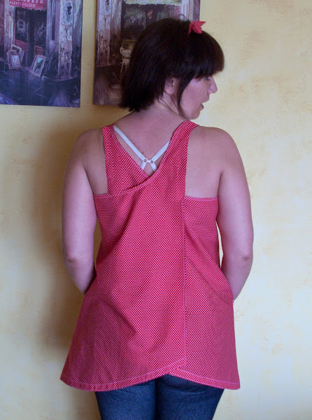 Su propuesta era para hacer una camiseta reversible pero como había vía libre para versionarla a nuestro aire pues mi primer pensamiento fue un vestido sin ser reversible y rematada con bies, pero no calcule bien la tela y al cortarla por detrás quedo muy corta al hacer los cruces en redondo y se me veía esa zona donde la espalda pierde su buen nombre, pensé en ponerle una pieza de otra tela pero no me gustaba nada de nada perdía toda la gracia original del patrón, así que lo deje como blusón largo para poner con un vaquero, pantalón corto o minifalda.