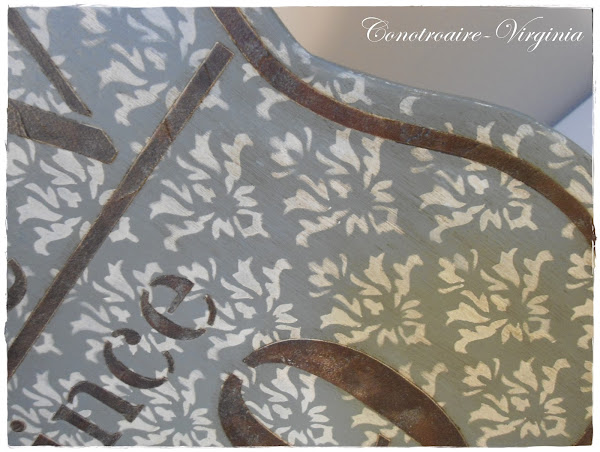 El fondo lo he pintado con pintura tiza verde, y sobre el he utilizado un stencil de arabescos en color blanco roto.