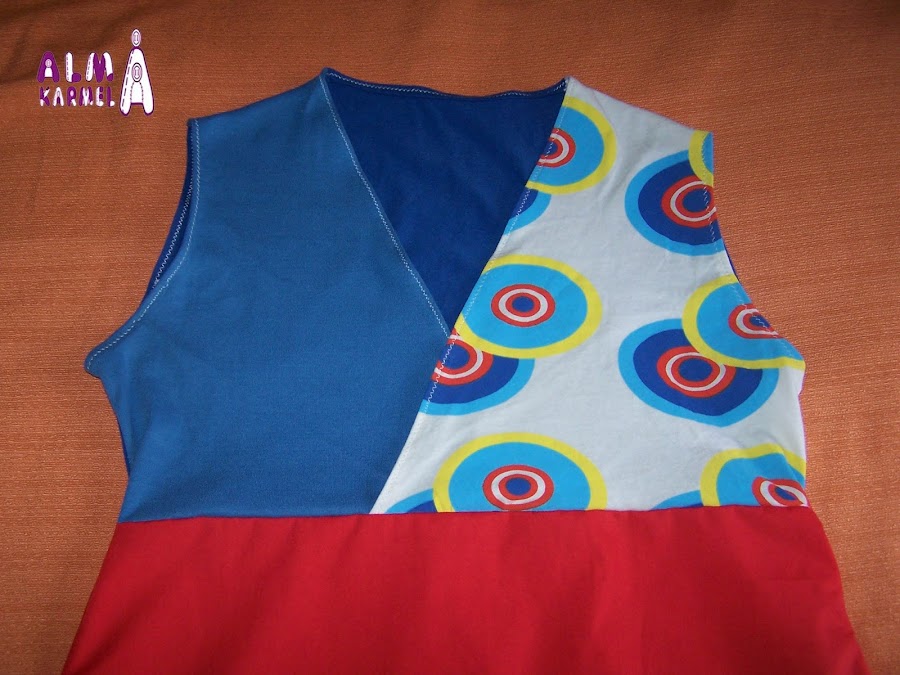 Arriba he combinado varias telas, un azul oscura para la parte trasera, azul más clara para un parte de la delantera y otra blanca con estampado de círculos de colores para el otro lado.