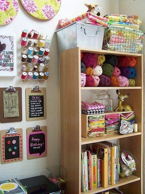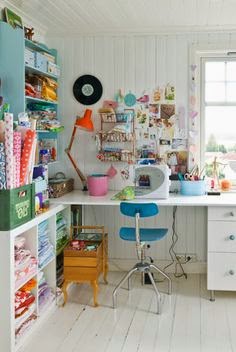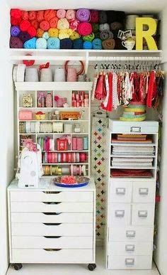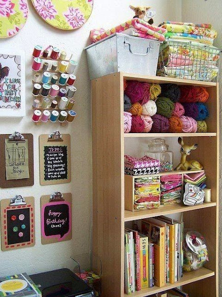 Algunas veces mientras navego por pinterest y veo zonas de trabajo o "rincones de costura" (con la idea de ponerme un rincón mono en casa donde tejer,ganchillear o "craftear" pienso... esta gente o tiene casas enormes o solo es el momento de la foto.Y es que mientras me desnuco tejiendo de mala manera en el sofá a horas intempestivas ( siendo madre de dos y estudiando por las mañanas es la única manera) sueño con tener un rincón de estos en casa ,que supongo, que solo se hará realidad el día en que o mis hijas se hagan mayores (y una de sus habitaciones se convierta en mi paraíso) o en su defecto me toque la lotería y pueda comprar un casoplon con un montón de metros cuadrados. Y mientras algunas de estas opciones se hace realidad yo acumulo y acumulo fotos de rincones soñados donde tener todos mis trastos ordenados.