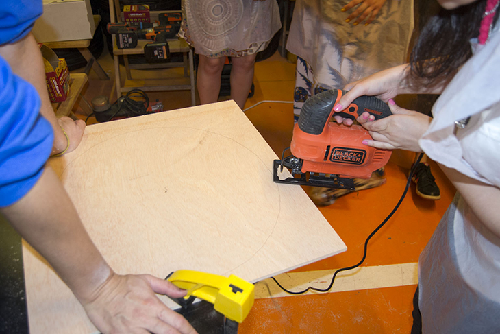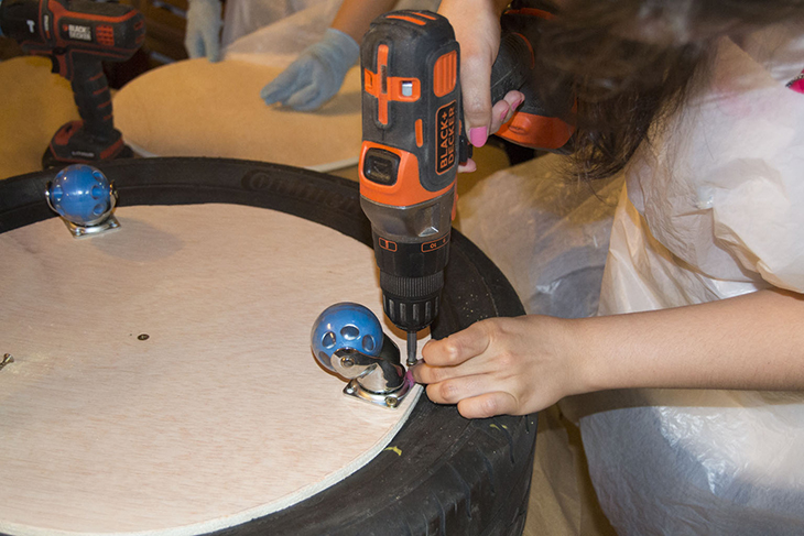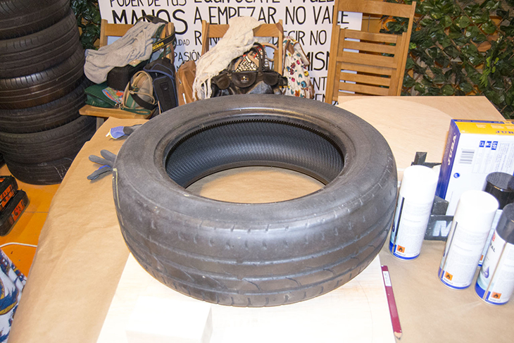 El taller consistió en convertir un neumático en mesa baja con ruedas y curramos un montón, que es lo que a mí me gusta: sierra de calar, atornillar, serrar, pintar con spray...eso sí, todo un lujo porque los chicos de Handfie nos ayudaron y enseñaron mucho.