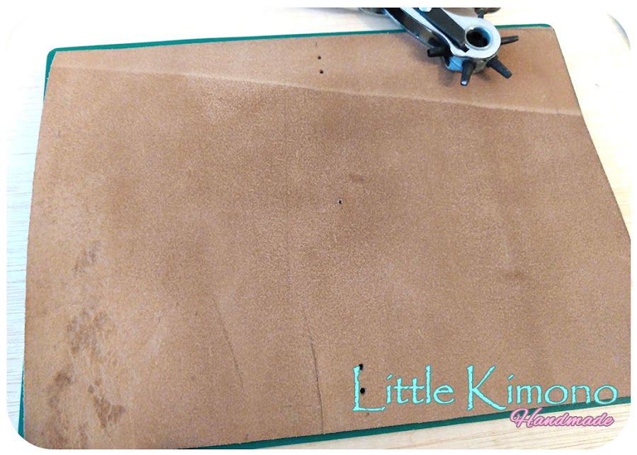 3. Con un sacabocados para piel o un punzón haremos los agujeros de los puntos que hemos marcado, 5 en total, en línea recta de arriba a abajo en el centro del trozo de piel.
