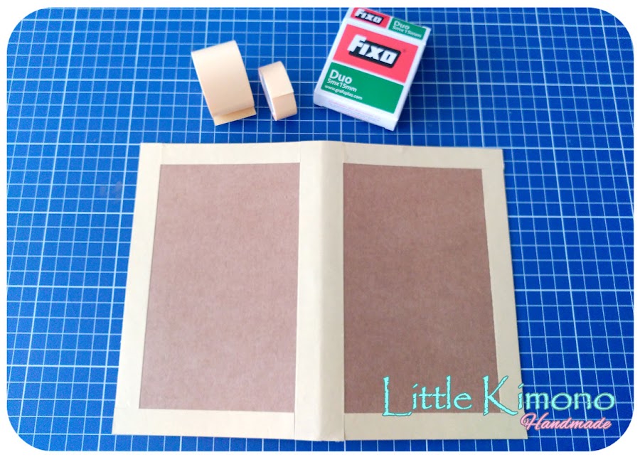 Sobre la pieza de kraft colocamos cinta doble cara en todos los bordes y en el centro (yo usé para los bordes la de 1,5mm y para el centro la de 3mm) y pegamos el papel de scrap encima.