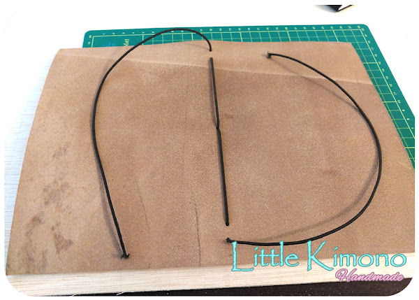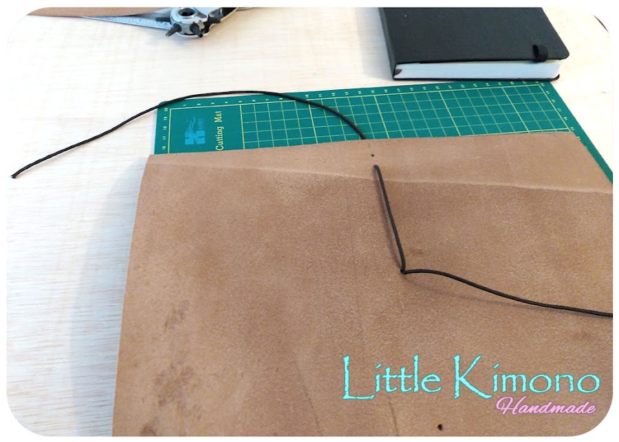 4. Colocamos el cuaderno cerrando la funda y medimos la cantidad de cordón que necesitamos para cerrarlo pasando el cordón a través de la funda.