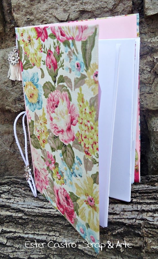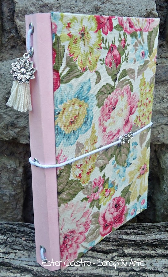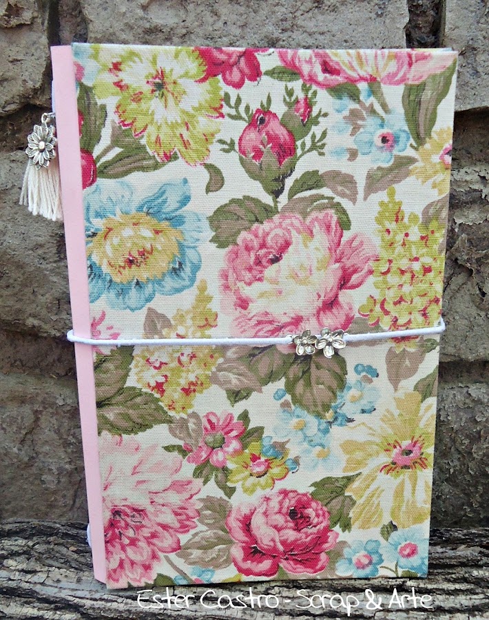 agregue una borla de flecos y un flor de metal en el lomo y unas flores de metal en el elástico del cierre de la tapa como decoración