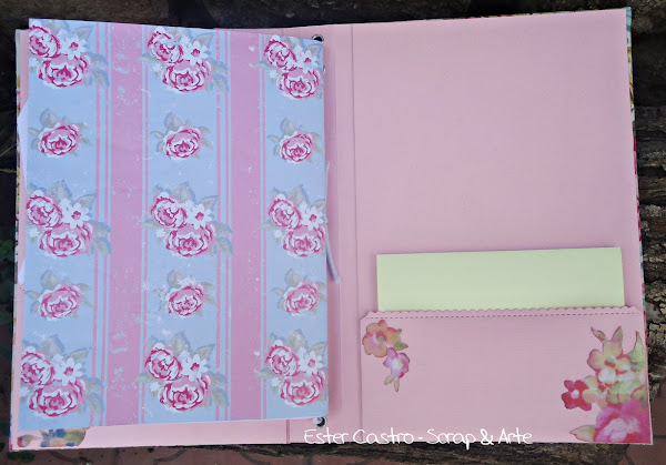 y en la parte de la tapa de atrás también hice un bolsillo al cual le coloque un bloc para notas