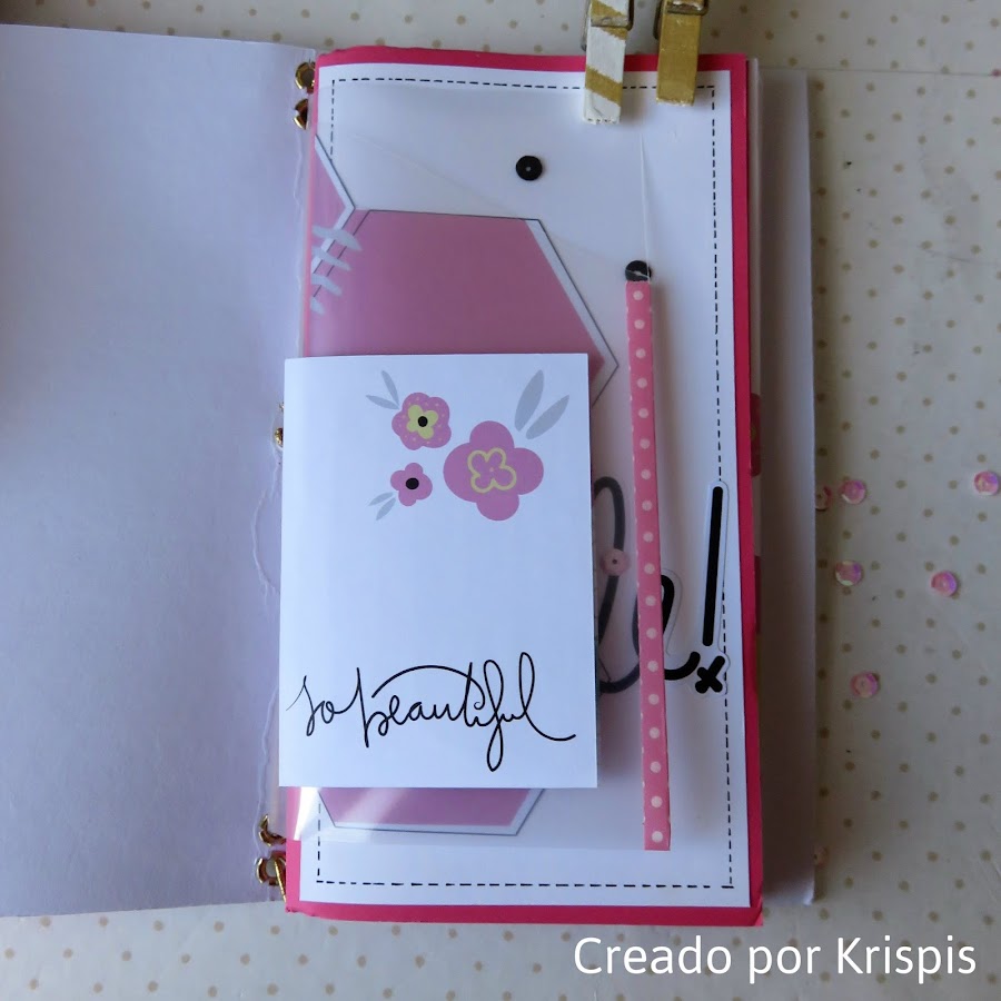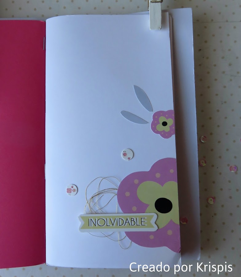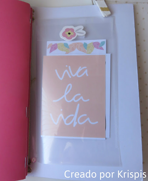 Luego he creado un bolsillo con una funda, para poder poner tikets, notas.... lo he cerrado con un velcro en el que he pegado una florecita para que no se vea, a modo de decoración unas tarjetas de la colección.