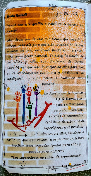 La idea era hacer un grafiti lleno de color y que la frase "Los superhéroes no saben de crosomosas" se viera muy bien, creo que lo conseguí, en la siguiente página explico el porque de la frase, de nuevo sobre ese fondo de ladrillos.