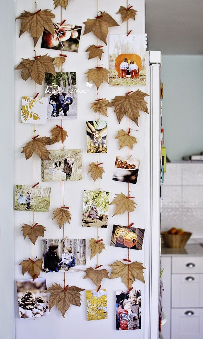 La siguiente idea podríamos considerarla como otra versión del móvil anterior, pero para interior. Cuerdas, pincitas, hojas y fotos y voilà! Ya tenemos nuestro mural-móvil con nuestras fotos favoritas para el otoño. Lo bueno de esta idea es que como está montado con pincitas, siempre podemos cambiar las decoraciones para que vayan con la estación o las fotos si tenemos alguna nueva más chula.