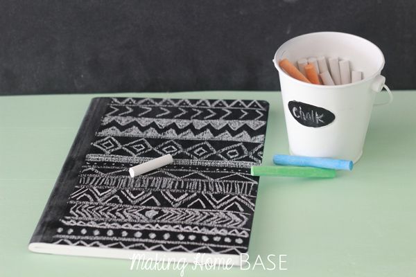 Otra idea muy divertida para los niños es esta portada de pizarra, siempre podrán tener una libreta diferente y con el dibujo que más les apetezca dibujar. Eso sí, tener siempre a mano una bolsita para que el bolso no se os llene de polvo de tiza.