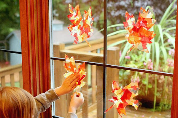 Preparar esto, tanto si hay peques en casa como si no, tiene que ser de lo más divertido: unas hojas con trocitos de papel de seda como cuando éramos pequeños para luego decorar las ventanas con ellas ¿a que mola? jeje