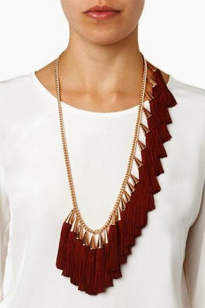 Para el día a día, si nos gusta llevar prendas lisas, nada mejor que ponerse un collar llamativo para dar personalidad a nuestro outfit. Este que os presentamos con flecos en color marsala seguro que no pasa desapercibido en la oficina.