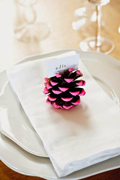 Otro detalle sencillo y que puede darle un toque diferente a nuestra mesa navideña es utilizar una pequeña piña pintada a modo de marcasitios. Es original y, una vez que cada invitado esté en su sitio, la mesa se llenará de pequeños toques de color cuando las retiren del plato.