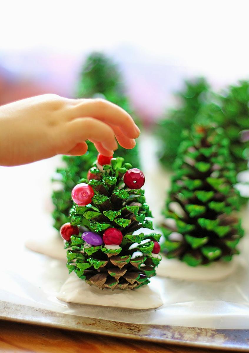 Estos sencillos árboles-piña pueden hacer que pasemos una tarde de lo más divertida con los más peques de la casa. Hacer la base, pintar las piñas y decorarlas con un montón de abalorios, cuentas y cadenas darán como resultado unos adornos únicos y muy especiales, dignos de estar expuestos en la mejor estantería de la casa ;).