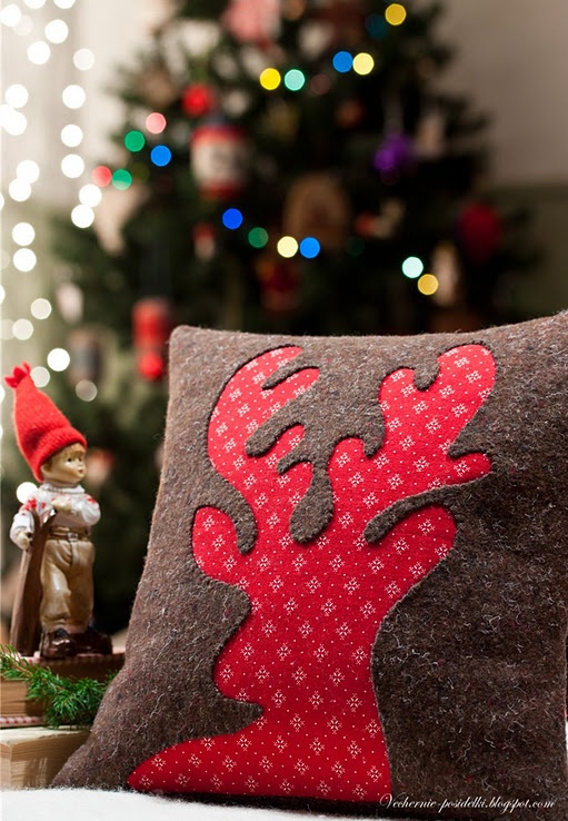 Comenzamos con un bonito cojín. Nos ha encantado el contraste de la tela oscura con el rojo para resaltar mucho más el reno. Ya veis en la foto que, acompañado de un gran árbol decorado, da a la casa un ambiente de lo más navideño.