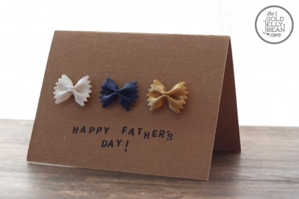 La primera idea que os traemos es de lo más sencillita y rápida, ideal si no tenéis mucho tiempo u os acordáis a última hora jeje. Es una bonita tarjeta hecha con cartulina para que los peques le entreguen a su papá un bonito mensaje o un dibujo en su interior. Además tiene un simpático toque con estos lazos de pasta pintados en tres colores (si usamos pasta de verduras nos podemos evitar el pintarlas) como si fueran pajaritas.