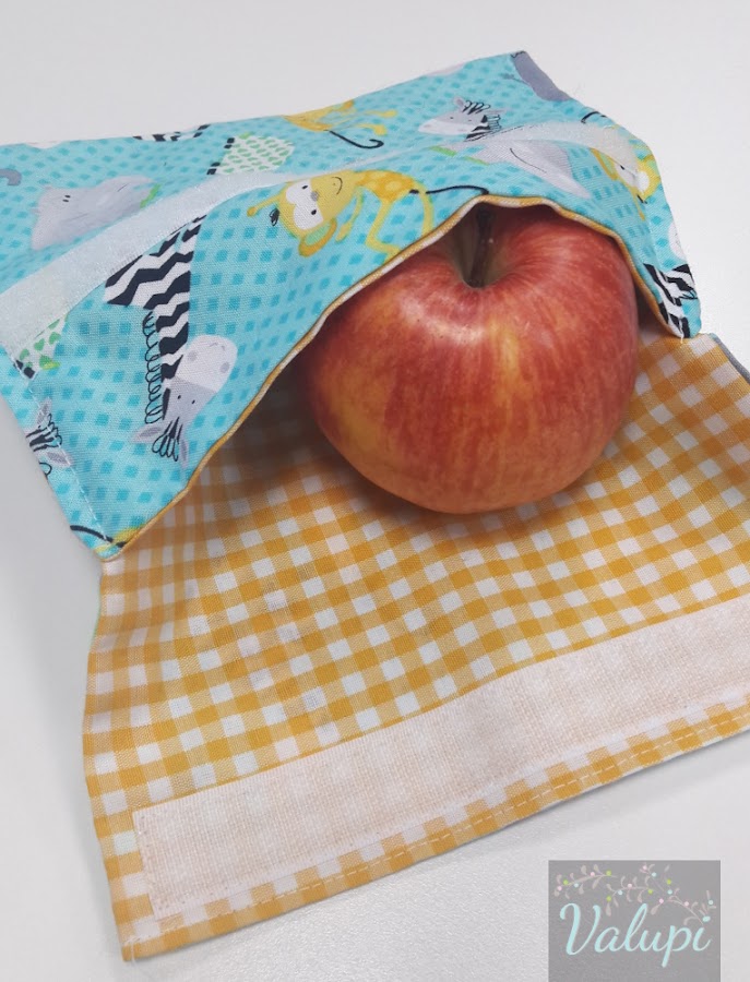 Como mi idea era usarla para llevar la fruta, galletas, etc. y no suelen manchar mucho, al final me decidí por usar unos retales de un par de telas de algodón que tenía por casa y que compré en la tienda de telas del barrio. ¿A que ha quedado graciosa?