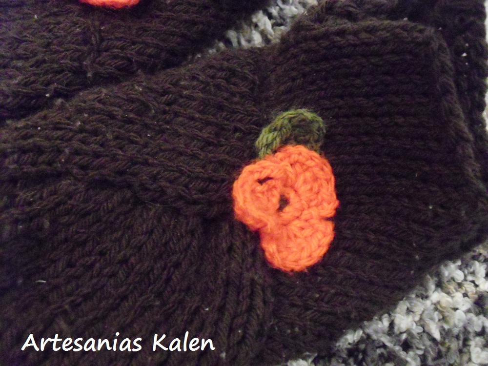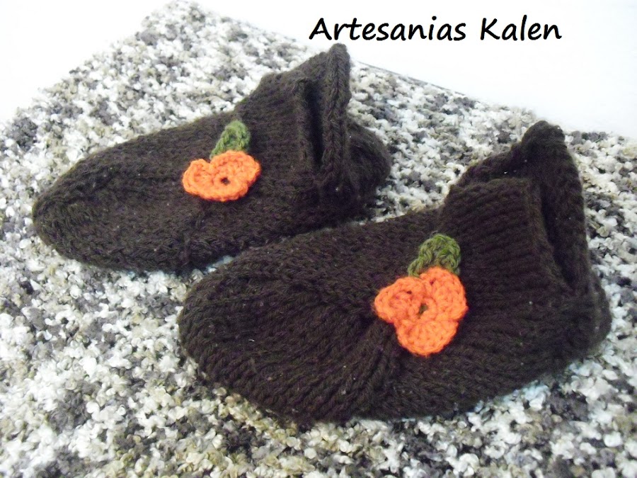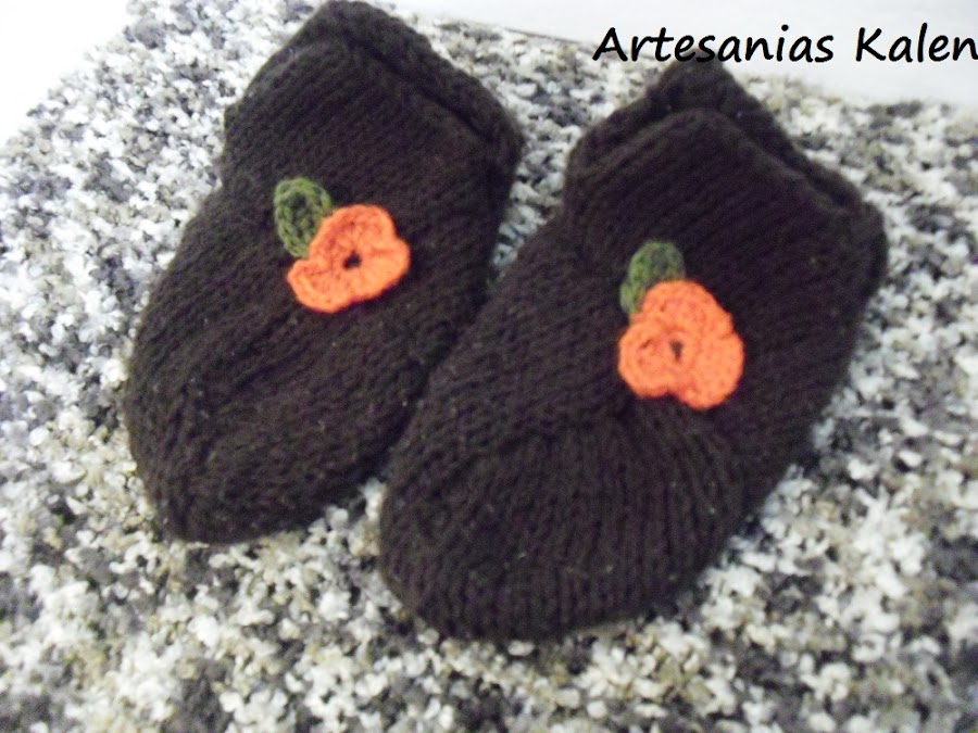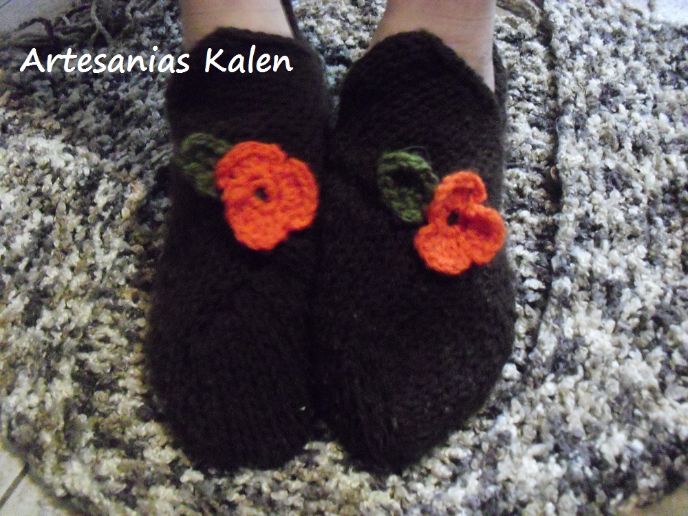Las realice a dos agujas en punto jersey y le aplique un detalle de flor al crochet.