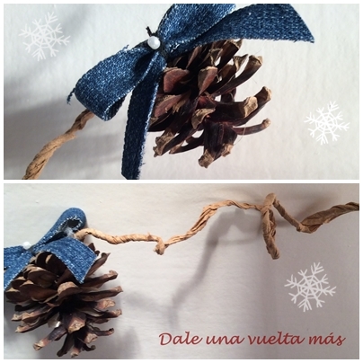 Las guirnaldas las confeccioné pegando con cola vinílica, pequeñas piñas sobre un hilo de papel madera,