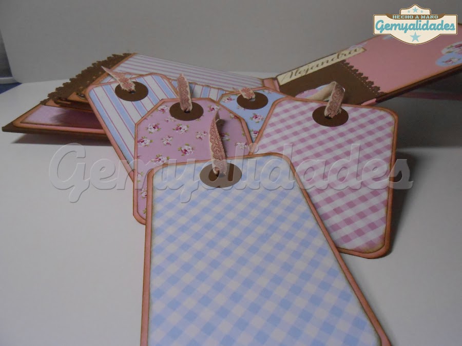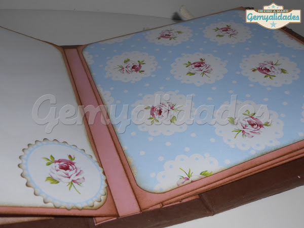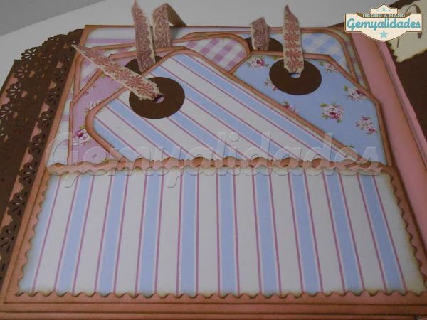Los papeles son de una tienda de Córdoba bastante conocida para los aficionados a las manualidades y que hacen ellos mismos sus papeles, son de estilo Shabby Chic. También podéis ver cartulina marrón y rosa que he utilizado para las tapas, las hojas y las tags.