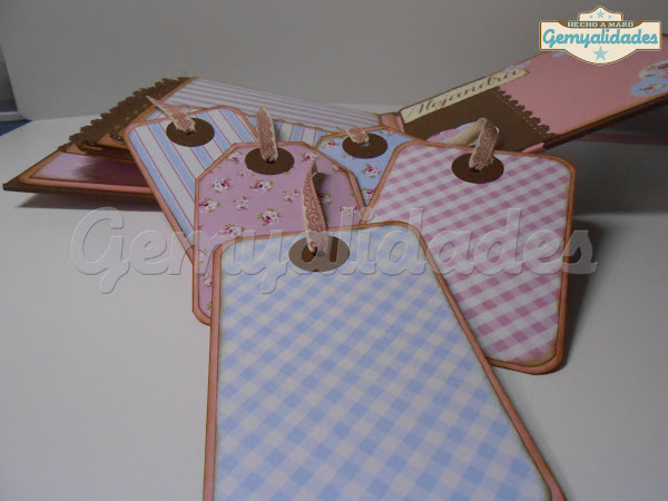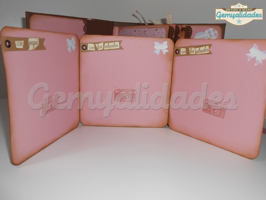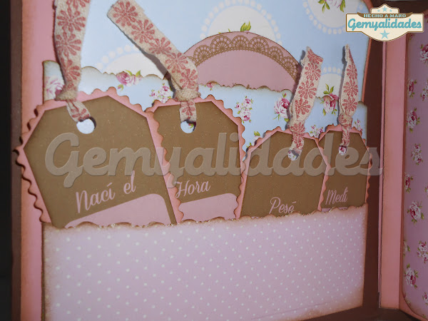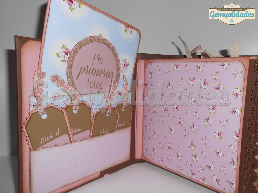 En el interior de la portada hice un bolsillo doble para meter un desplegable para las primeras fotos de Alejandra con sus padres y abuelos y poner unas tags con sus datos de recién nacida.