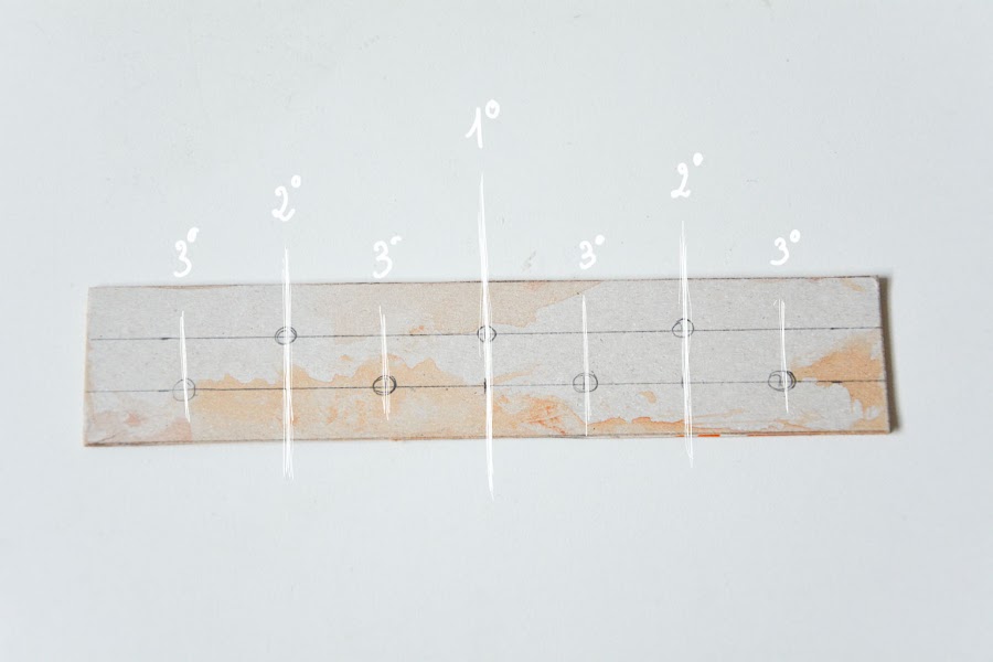 El patrón para hacer los agujeros es muy sencillo. Primero dividimos la pieza en tres partes. Como la mía era de tres centímetros, cada parte es de un centímetro. Ahora dividimos por la mitad a lo largo. Y cada parte otra vez por la mitad. Tenemos cuatro partes. Y ahora, esas cuatro partes de nuevo por la mitad. Tenemos ocho partes. Marcamos los agujeros uno sí otro no, arriba y abajo, de forma que nos quede así.