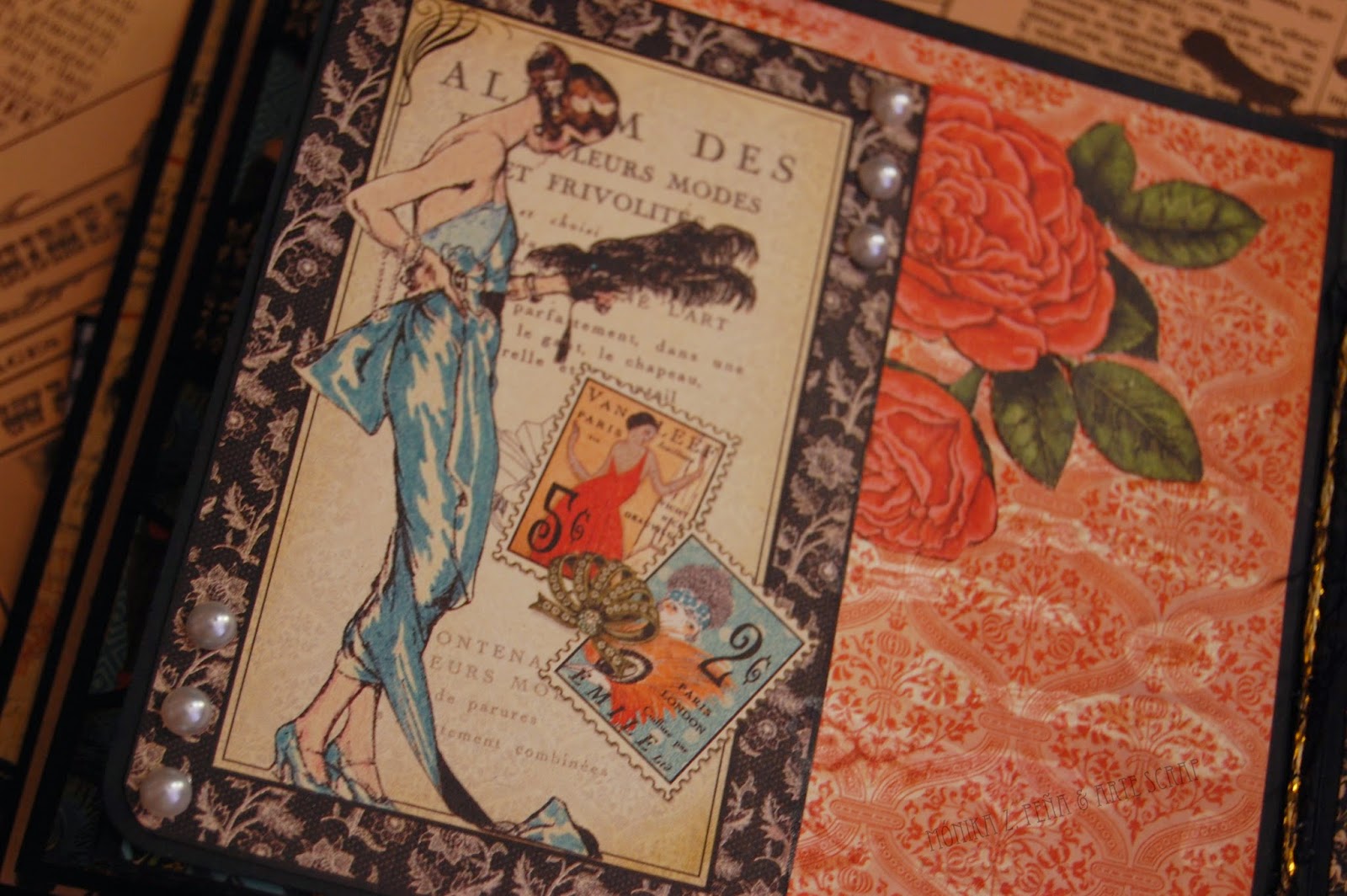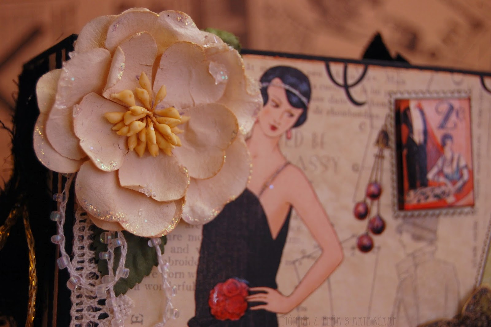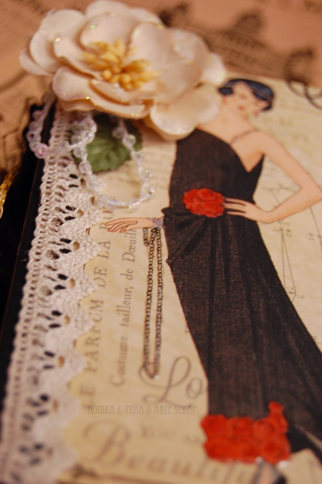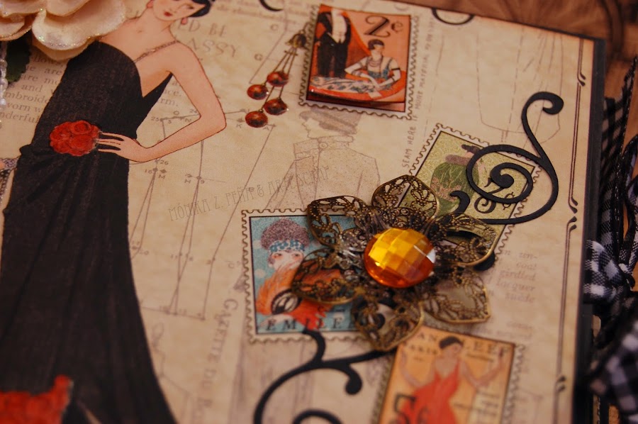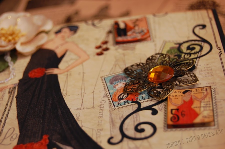 Para decorar utilicé flores de papel, estampaciones con los sellos de Prima Marketing y por supuesto, algunos detalles recortados de los papeles de G45 "Couture".