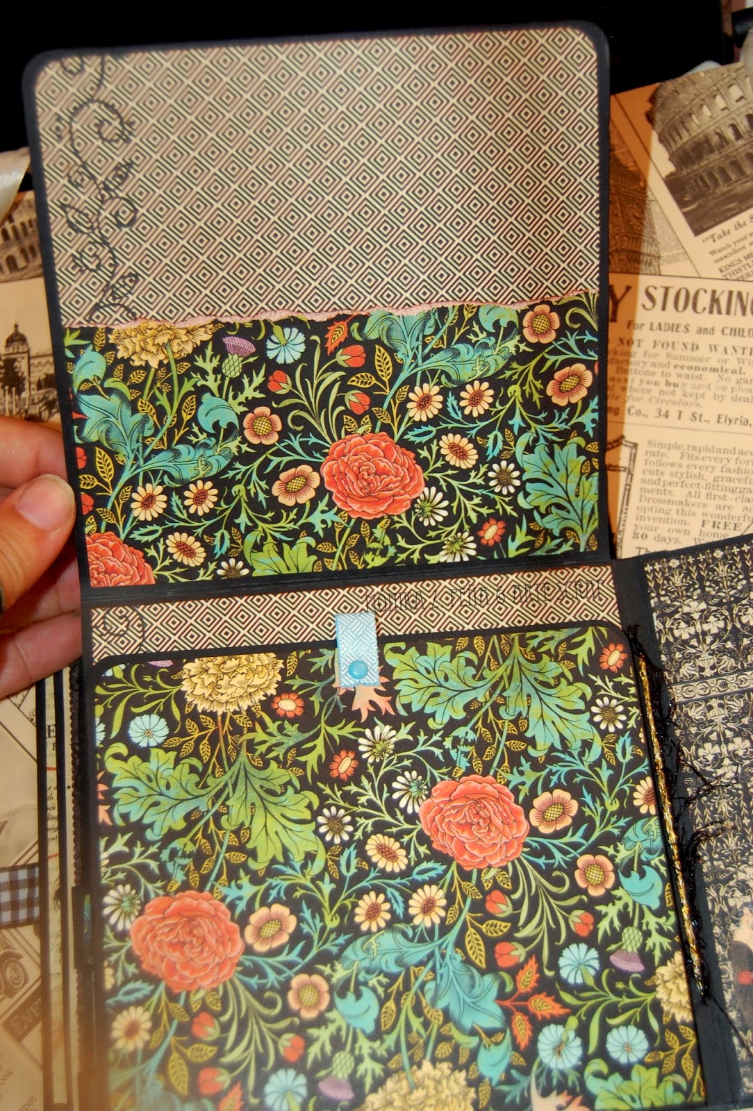 Para asegurar más la sujeción de las páginas, también las cosí con un par de cordeles color negro y oro, que a su vez, sirven para decorar el lomo con una lazada.