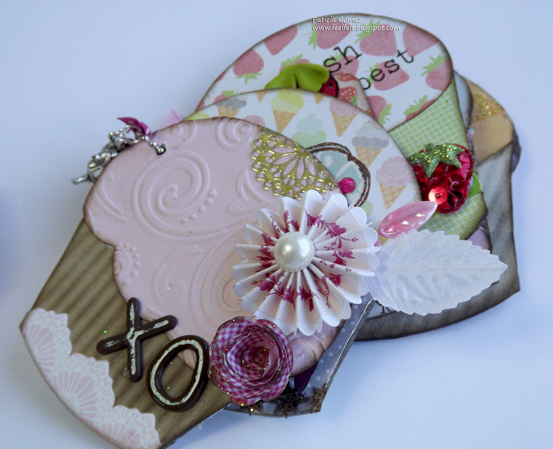 La media flor y guinda que aparece en un troquel de Sizzix, creo que Daisy flowers. Los corazones pequeños son rub-ons, el grande un sticker.