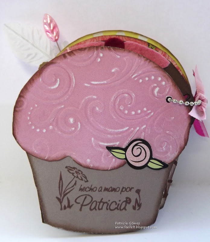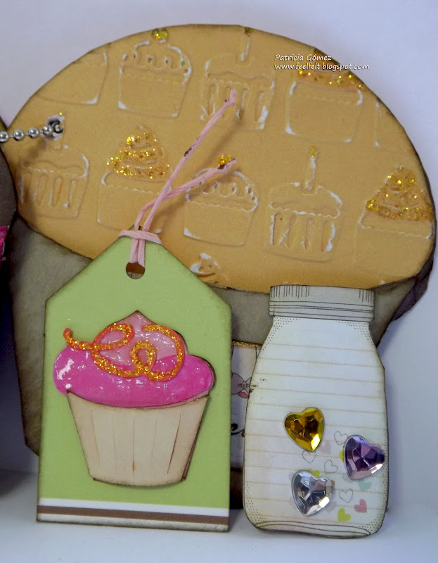 A la derecha, la cartulina naranja embosada con con una carpeta de cupcakes, que es del set Cuttlebug Once upon a Princess, lleva toques de stickless.
