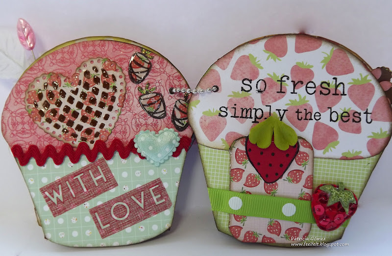 A la izda, troquel de corazón Heart Lace Joy Crafts , fresas pequeñas (sellos de Hampton Art) y el texto With Love, es una masking tape.
