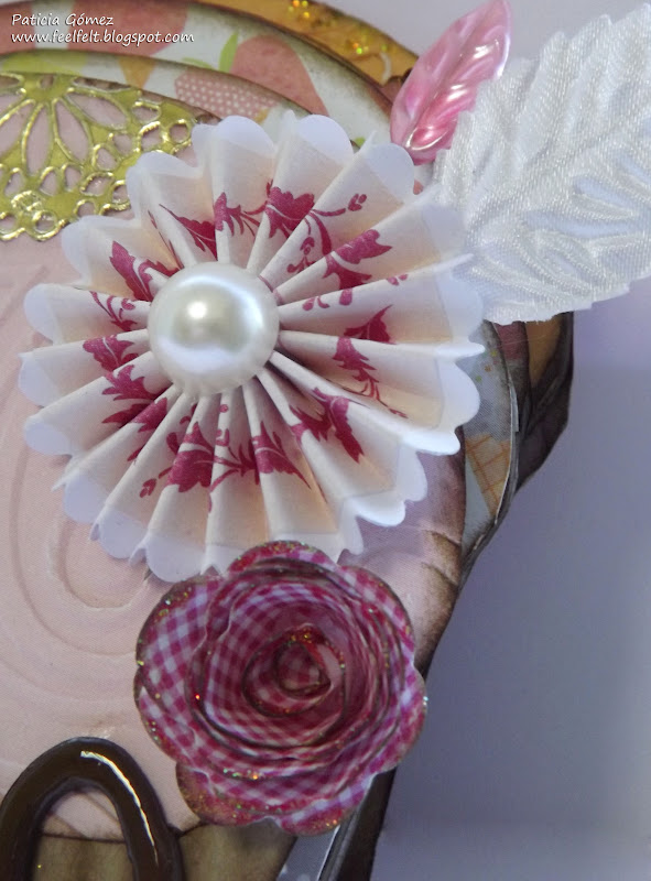 La flor con perla blanca es Sizzix Tim Holtz Decorative strip paper rosette, mientras que la de abajo, enrollada, es Sizzix Bigz Die - Flowers 3D.