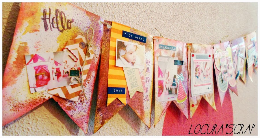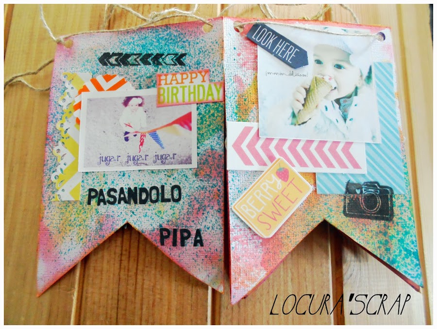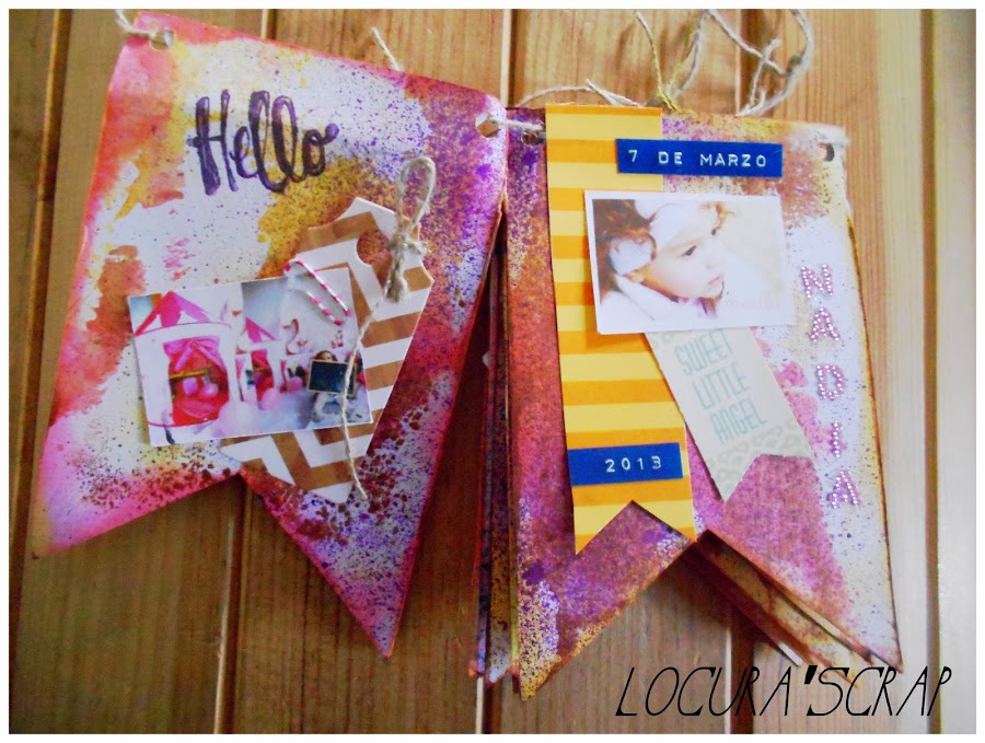 La base del mini álbum son dos papeles básicos blancos,con los que hemos hecho unos banderines , y en los que hemos estado guarreando un poco con las tintas distress ink y dylusions ink spray , para darle color.