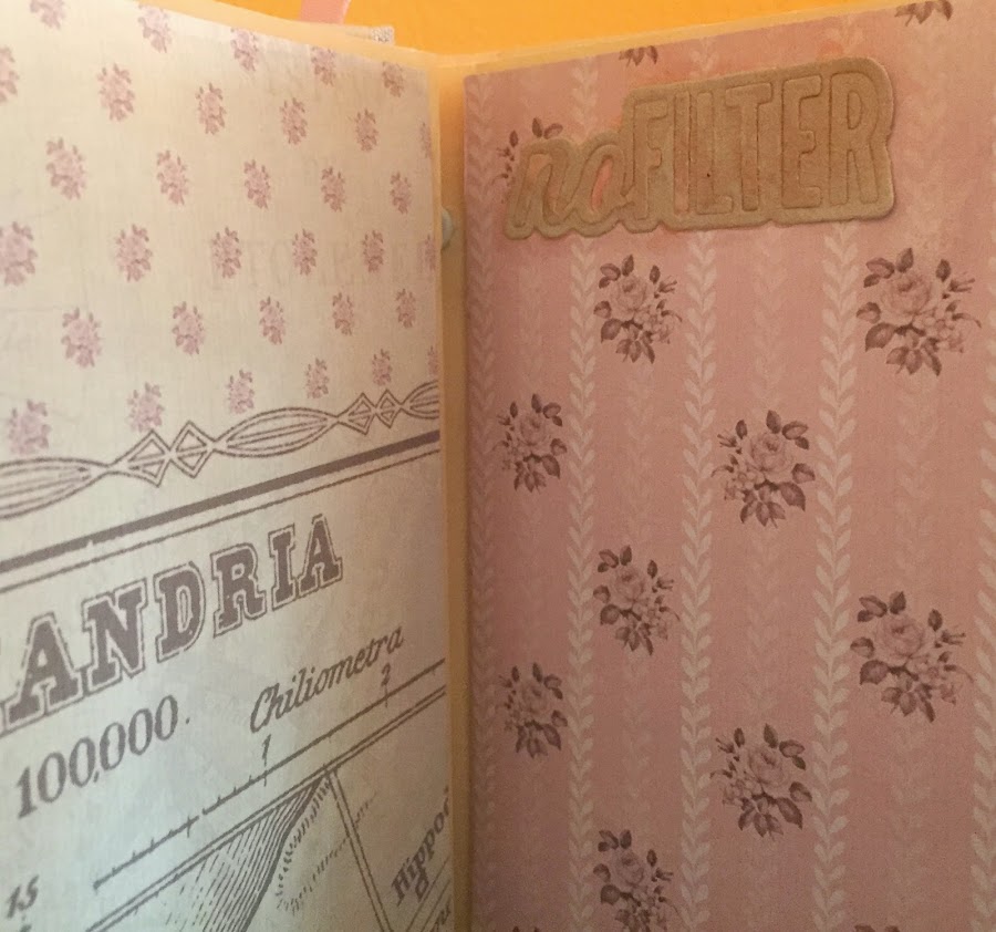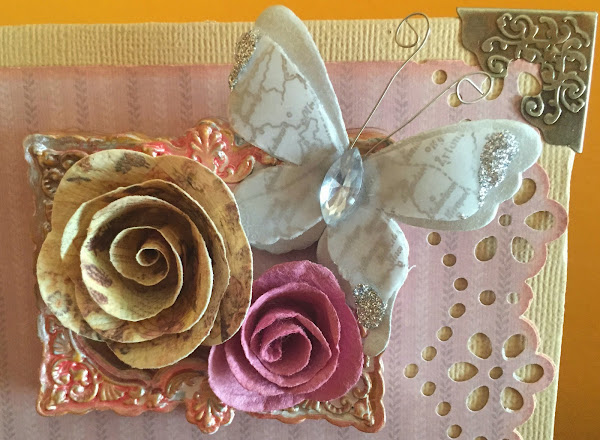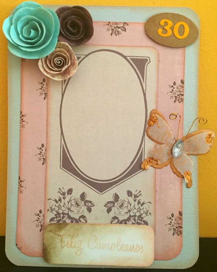 Los papeles es de la colección ALEJANDRIA de Marisa Bernal y el lomo esta forrado con tela de lino y atado todo con un lazo de raso rosa y la portada tiene un marquito de plástico que originalmente era en color negro, pero yo lo altere con colores rosas dorados y grises y unas flores y mariposa de la marca PRIMA a juego con los papeles y una frase troquelada como titulo. A juego con el álbum y aprovechando restos de papel le hice una tarjeta de felicitación.
