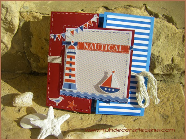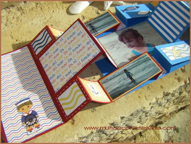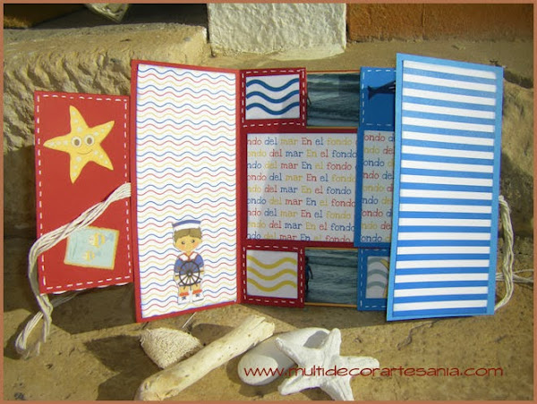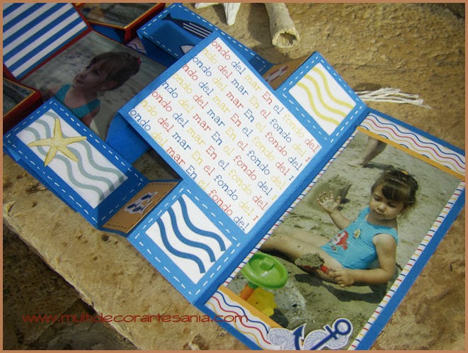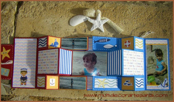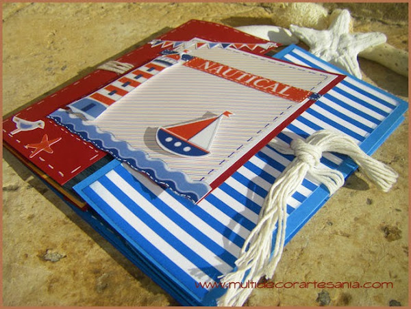 Hoy os traemos un mini-álbum con una estructura que me ha gustado mucho hacer, para ello he utilizado restos de papeles y cartulinas intentando que combinaran entre si para crear una temática náutica, también incluí unas fotos del verano del 2000 con mi hija Elena en la playa.