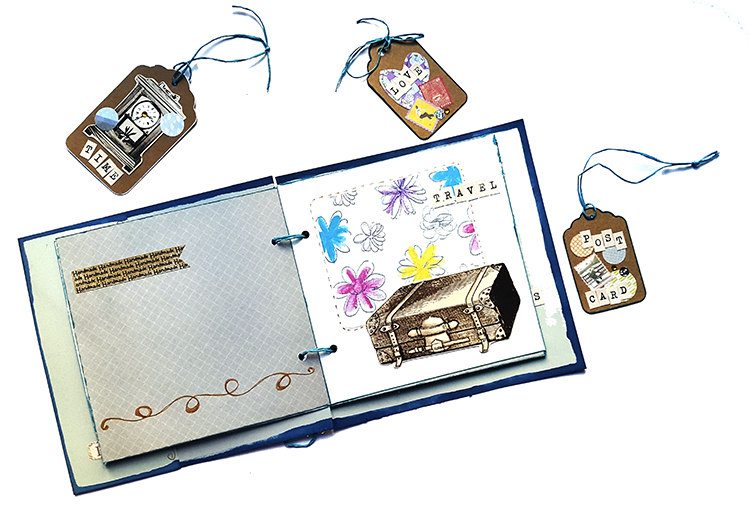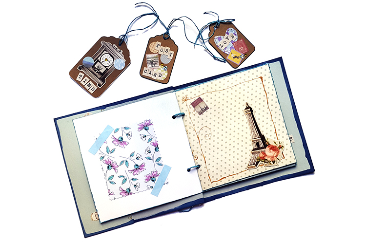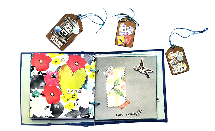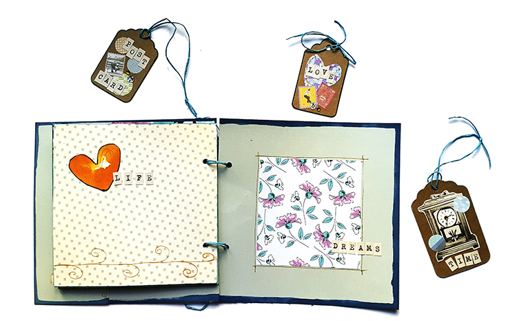 Abans de començar a decorar hem fet els forats per poder passar el cordill per enquadernar. Hem marcat el centre de les tapes i de les pàgines i els hem fet amb una perforadora doble, full a full. Ja tenim la base preparada per deixar anar la nostra creativitat. Decoreu com vulgueu i, si voleu, podeu substituir el cordill per anelles, cinta, o botons. També podeu afegir targetes, etiquetes i tots els complements que us agradin.
