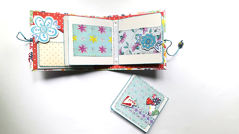 Com us hem dit abans, nosaltres hem fet servir els nostres propis dissenys de paper per fer les decoracions interiors; també hem dissenyat, nosaltres mateixes, les flors de decoració i les lletres de la portada. Hem inclòs una petita tarja a conjunt amb el mini àlbum.