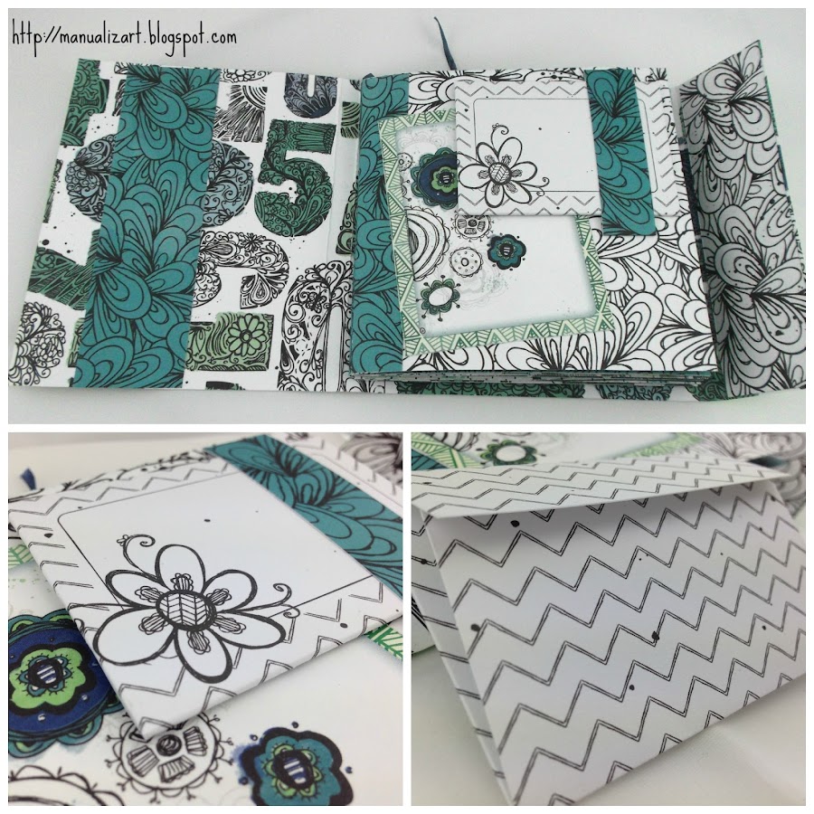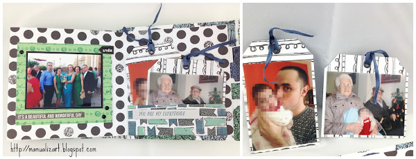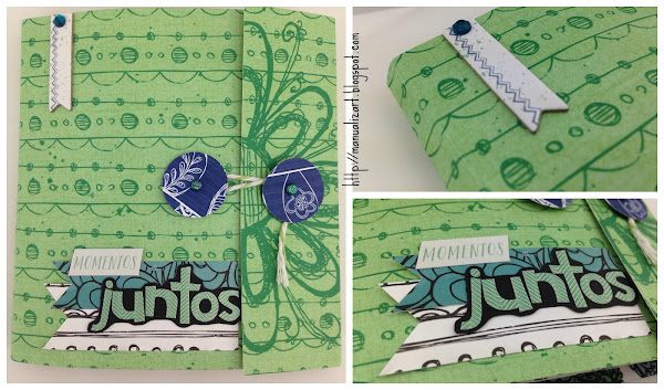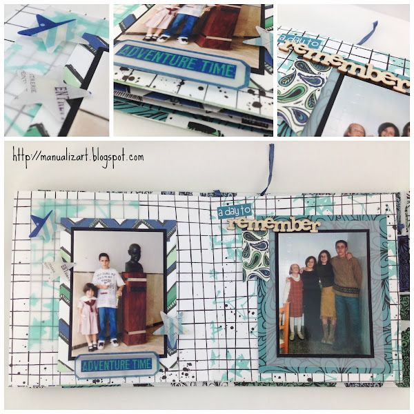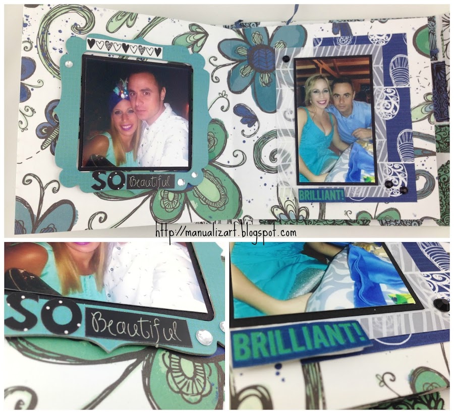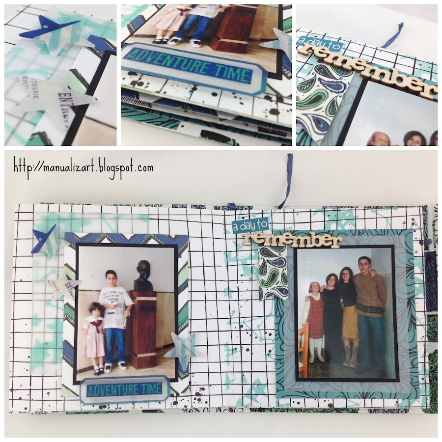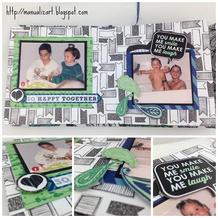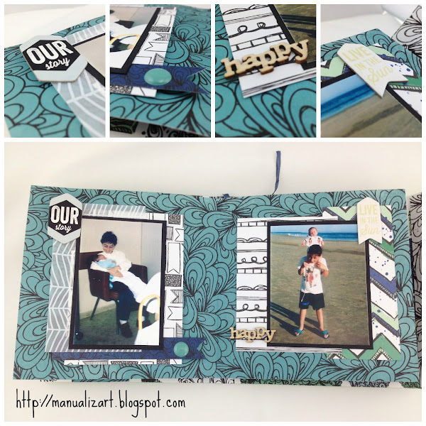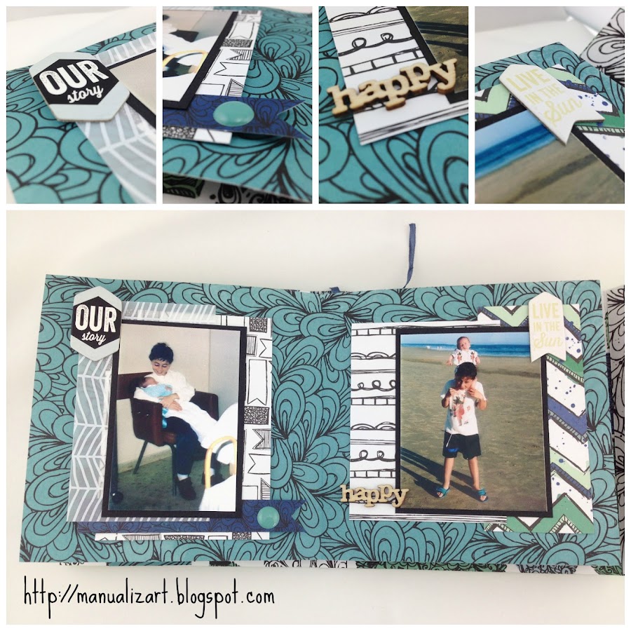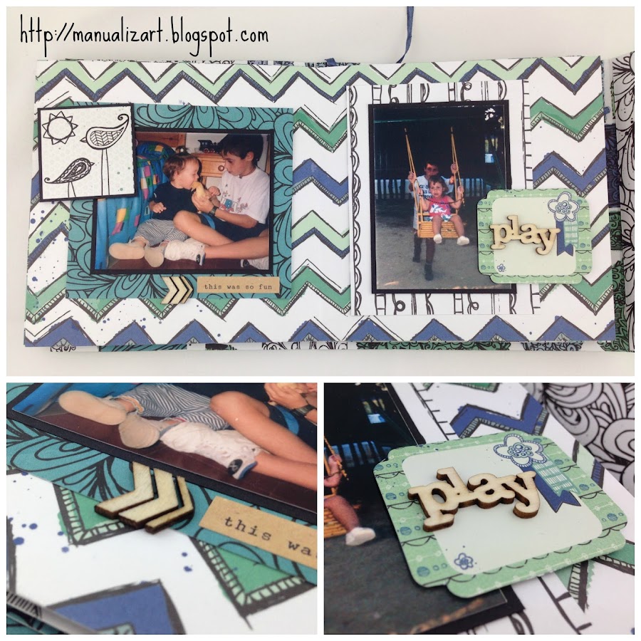 Para el mini he utilizado papeles y adornos de la colección Zip-A-Dee-Doodle de BoBunny. La estructura ya la tenía hecha desde hace algún tiempo, esperando la ocasión ideal para llenarlo de fotos, así que solo quedaba buscar la combinación perfecta de capas de papel y adornos que le dieran el toque mágico a las fotografías.