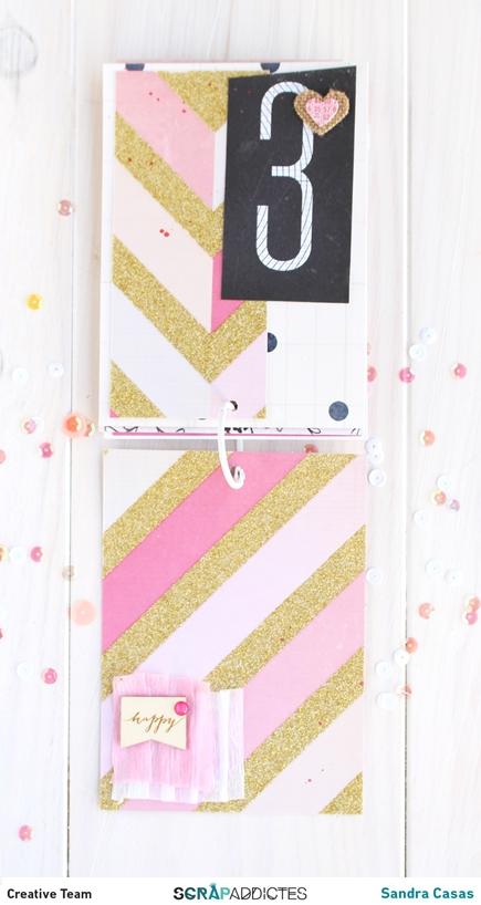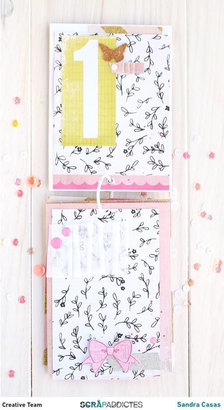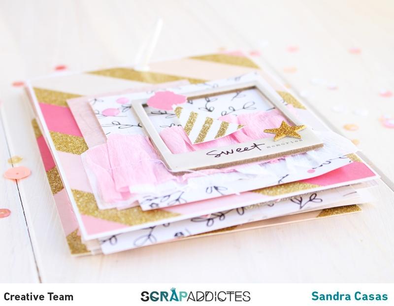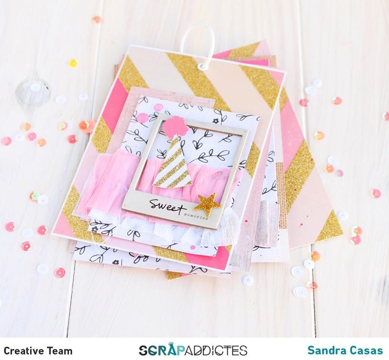 He combinado los papeles de Craft Market y de Confetti para realizar este miniábum, con muchos adornos, chipboards, dots y papel crepé.