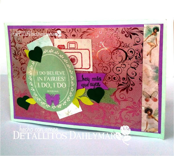 Lo hice siguiendo el sketch de este mes en LatinaCrafter agregandole una camára de uno de sus sellos que, aunque esta descontinuado, es uno de mis favoritos para usar en mini albumes.. y también usé un sello del set "Feliz Día del Amor", que me pareció que encajaba perfectamente con la frase de Peter Pan que trae el tag de la colección. Ustedes que opinan?