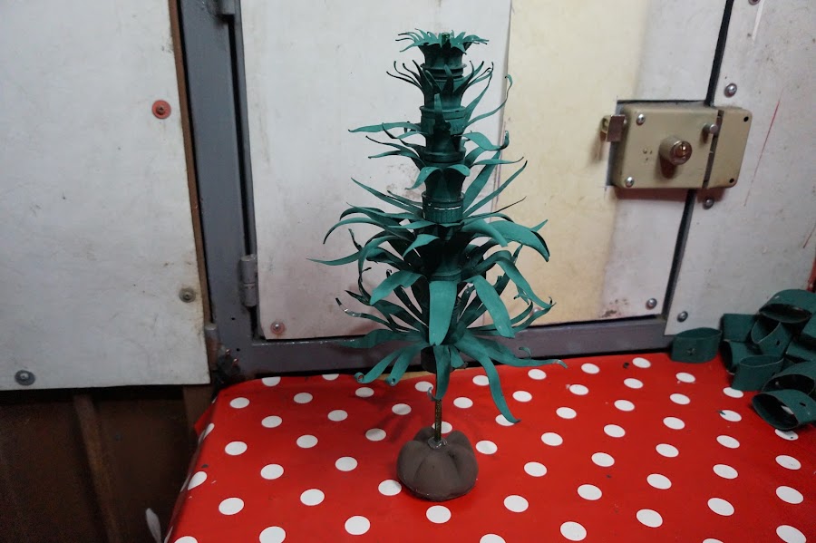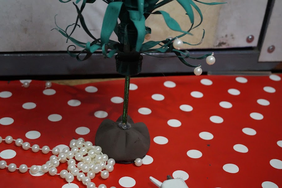 Comenzaremos a insertar uno a uno los tipos pétalos del mayor al menor tamaño de botella. Pegaremos con silicón caliente todas, para que nos quede como un pinito. Decoraremos con cuentas de plástico y pegandolas con el silicón caliente para así por último hacer una estrella en la parte de arriba con otra base de botella pequeña. Lo harás de esta manera:
