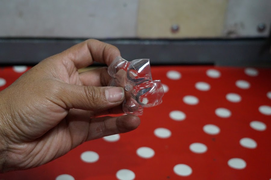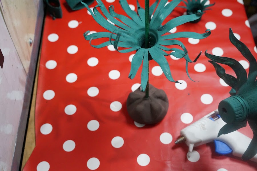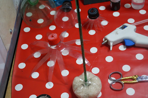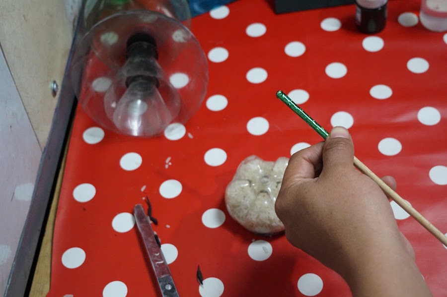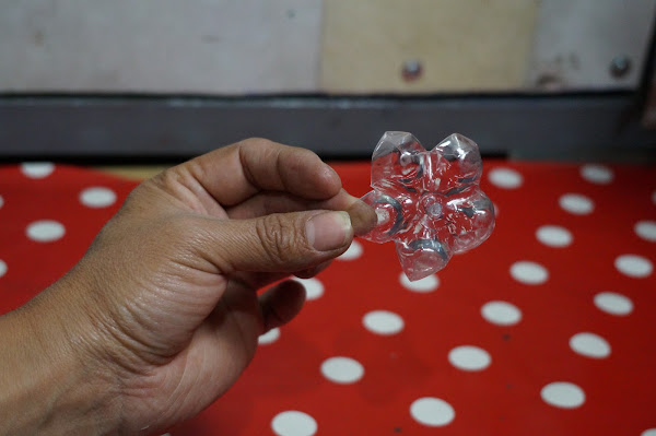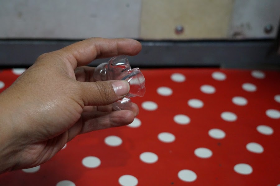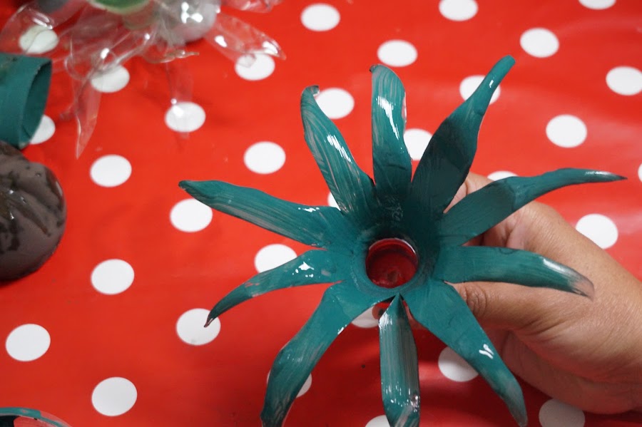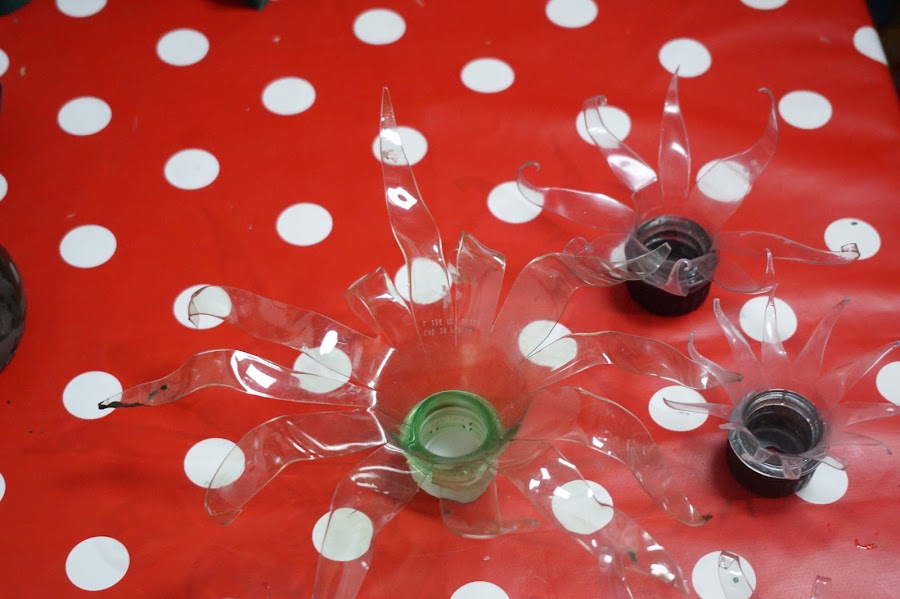 Ahora cortaremos las partes de arriba como si hiciéramos pétalos. Esto en todas las botellas y las pasaremos por algo caliente para que se estilicen y se vean como pétalos de flores.