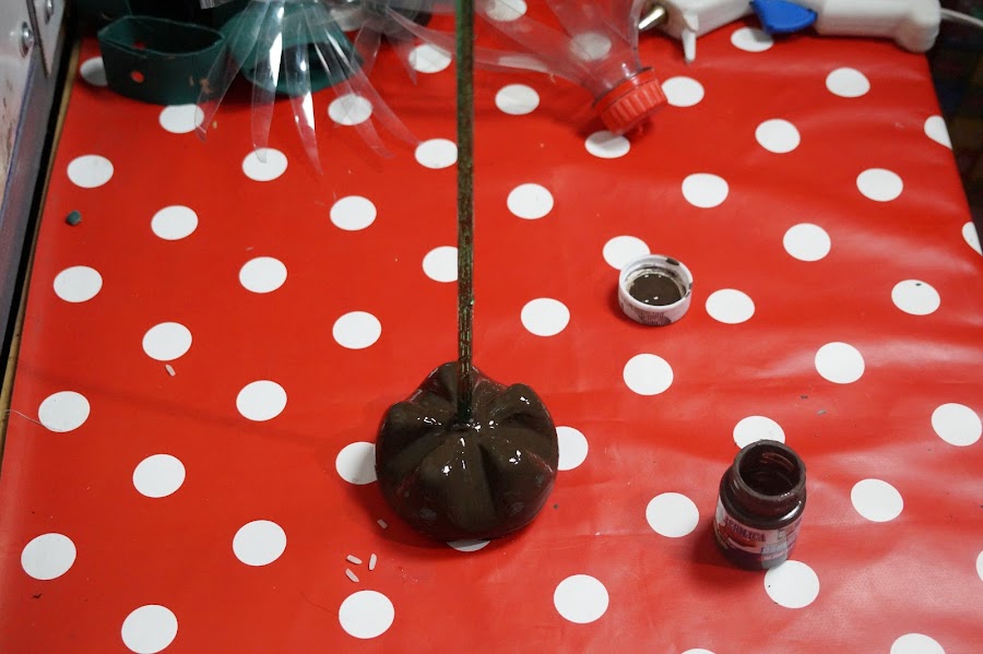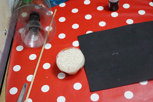 Tomaremos la base de una botella de refresco, haremos un hoyo en el centro con cautín o algún cuchillo caliente y llenemosla de arroz, para poder tapar con un pedazo de fomi negro y silicón. Ahora insertaremos el palito previamente decorado con la cinta decorativa y pegamos con el silicón.