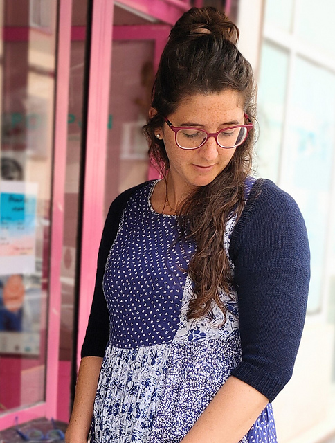 Lo que se me ocurrió fue que era una chaqueta normal, tejida de arriba abajo, ranglán y sin delanteros. Así que hice las cuentas como si fuera a tejer una chaqueta, omití los puntos de los delanteros y tejí normal. Al llegar a la sisa, hice solamente unos 2 centímetros (como ella quiso) y para terminar le di una vuelta a todo el bolero con punto elástico. Está hecho de una pieza y sin ninguna costura, como a mí me gusta