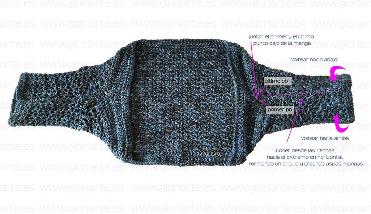 Coser las mangas. Cerramos cada manga con una costura, formando un círculo. Debemos unir el primer punto bajo de la primera vuelta que forma la manga, con el último punto bajo de esta misma vuelta, y coser horizontalmente hasta llegar al extremo. Así creamos las 2 mangas.